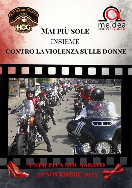 In occasione della giornata internazionale per l'eliminazione della violenza contro le donne, il Monferrato Chapter ha organizzato un evento benefico a favore di Me.dea, il centro antiviolenza che opera sul territorio alessandrino. La sfilata per le strade di Alessandria ha visto la partecipazione di diversi chapter ed amici harleysti. Per l'occasione ogni partecipante doveva indossare qualcosa di rosso... Un corteo di Harley Davidson colorate e "rumorose" perchè sulla violenza contro le donne non si può stare in silenzio!